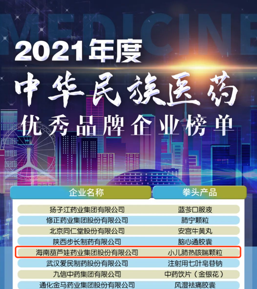 12月29日,全国工商联医药业商会发布了“2021年度中华民族医药优秀品牌企业榜单”,918博天娱乐旗舰药业集团凭借黄金单品小儿肺热咳喘颗粒(4克)实力登榜。